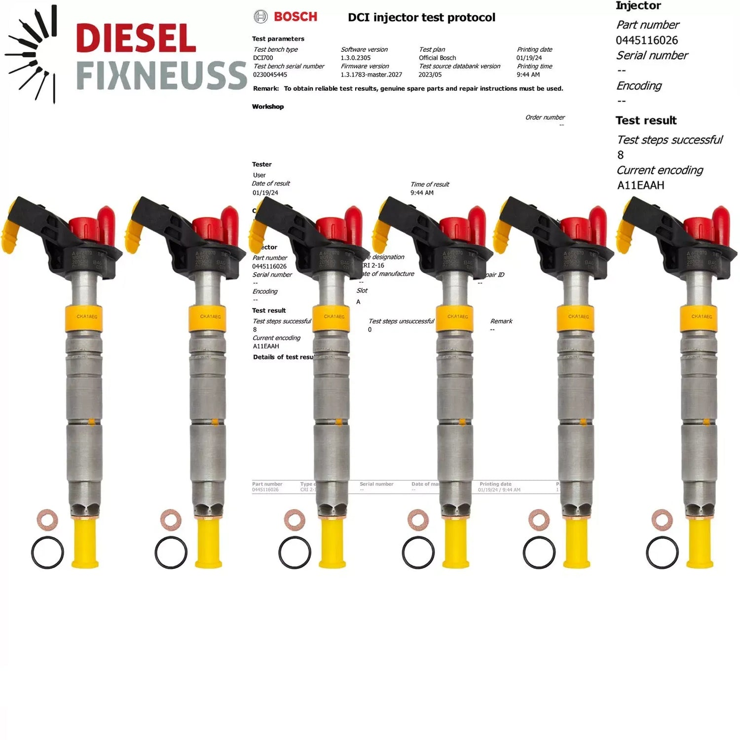 6x iniettore AT incl. anello di tenuta in rame + O-ring + rapporto di prova BOSCH in dotazione.